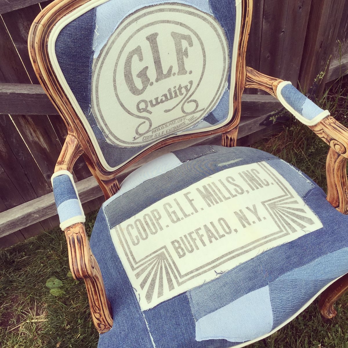 We reupholstered a funky vintage chair with a mix of raw edge salvaged denim and a NY Antique feed sack. It was professionally reupholstered with our handmade fabric. It has double piping and lots of character. Only one available.